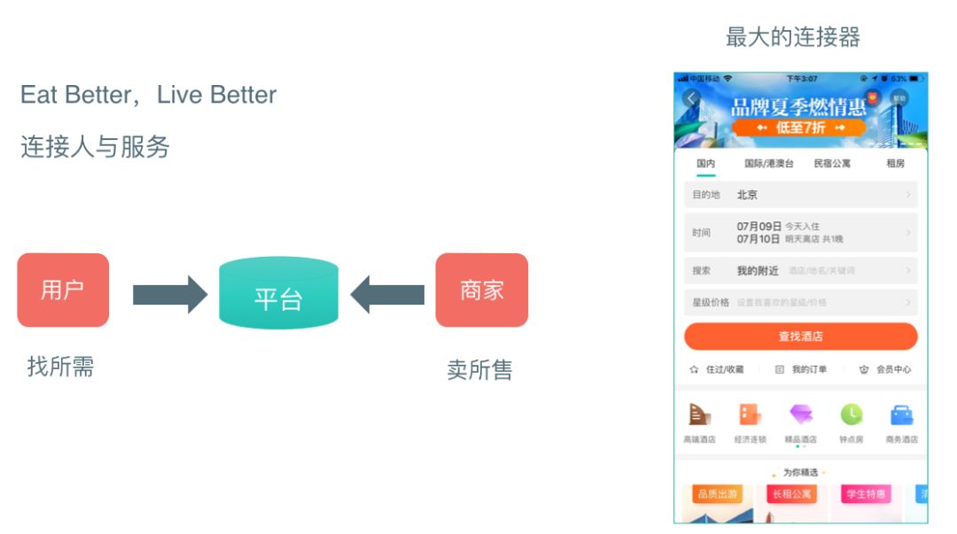 美团的使命是帮大家“Eat Better,Live Better”,所做的事情就是连接人与服务。用户在美团平台可以找到他们所需要的服务,商家在美团可以售卖自己提供的服务,而搜索在其中扮演的角色就是“连接器”。大部分用户通过美团App找酒店是从搜索开始的,搜索贡献了大部分的订单,是最大的流量入口。在美团首页点击 “酒店住宿”图标,就会进入上图右侧的搜索入口,用户可以选择城市和入住时间并发起搜索。