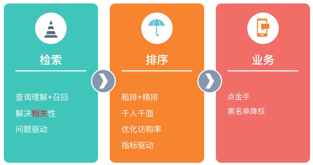 - 技术瓶颈期:这个阶段的特点是基本的东西都已经做完了,在原有的技术框架下效果提升变的困难。这时需要做升级,比如将传统语义模型升级成深度语义模型,开始尝试深度排序模型,并且开始探索强化学习、多模型融合、多目标学习等。