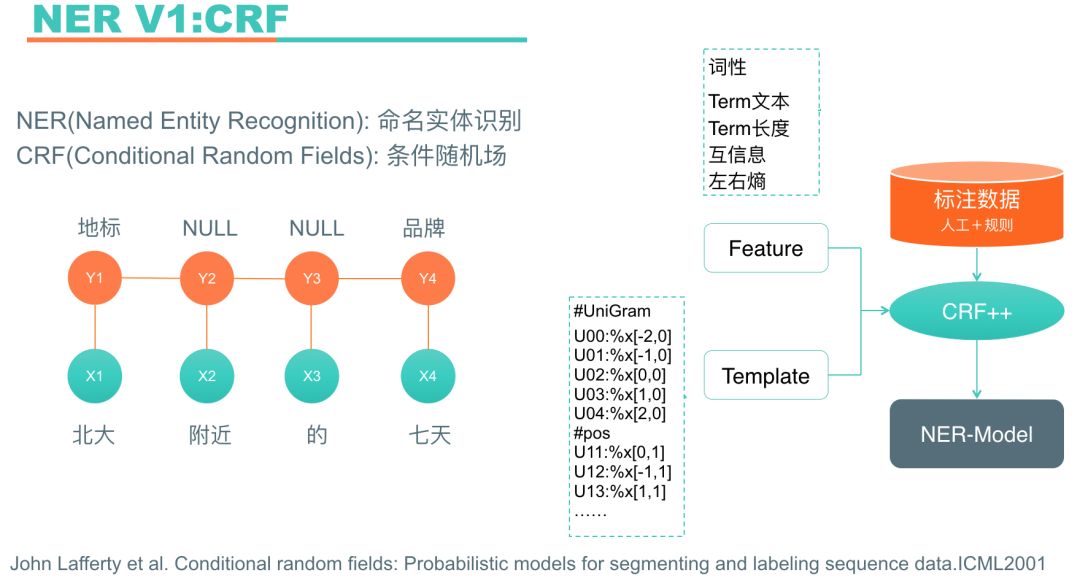 机器学习问题的求解就是“数据+模型+特征”,数据方面先根据业务特点定义了几种实体类别,然后通过“人工+规则”的方法标注了一批数据。特征方面提取了包括词性、Term文本特征等,还定义了一些特征模板,特征模板是CRF中人工定义的一些二值函数,通过这些二值函数,可以挖掘命名实体内部以及上下文的构成特点。标注数据、模型、特征都有了,就可以训练CRF模型,这是线上NER问题的第一版模型。