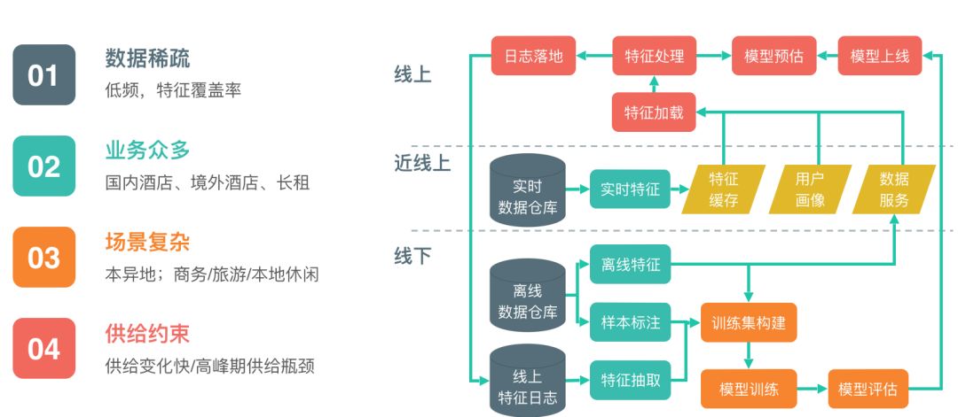 上图右侧是排序的整体架构图,分为线下、线上和近线上三个部分。在线下部分,主要做离线的模型调优和评估,线上部分做预测。这里比较特别的是近线上部分,我们在实时层面做了大量的工作,包括用户的实时行为、酒店实时价格、实时库存等等,以应对供给变化快的特点。