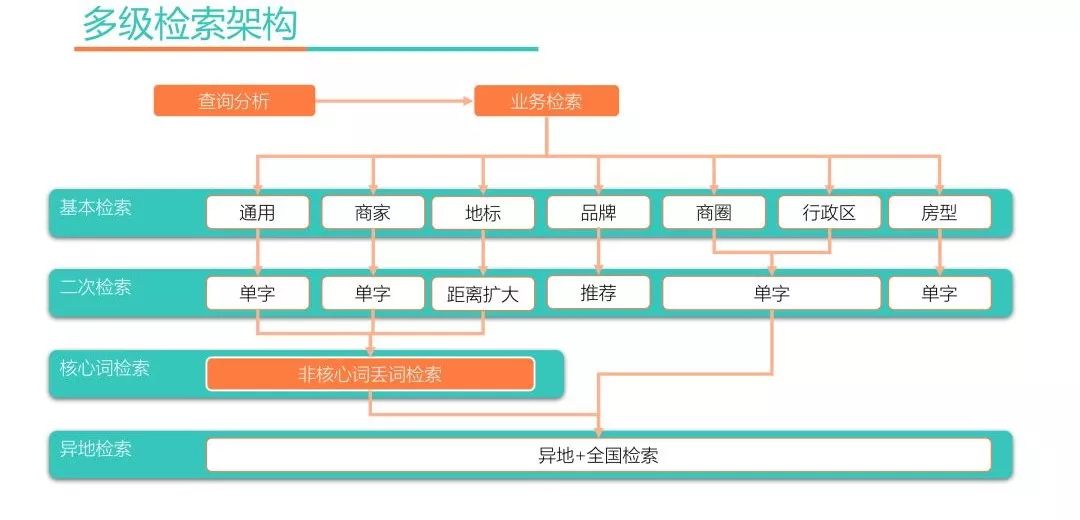 为了解决少无结果的问题,我们设计了多级检索架构,如上图所示,主要分4个层次:基本检索、二次检索、核心词检索和异地检索。