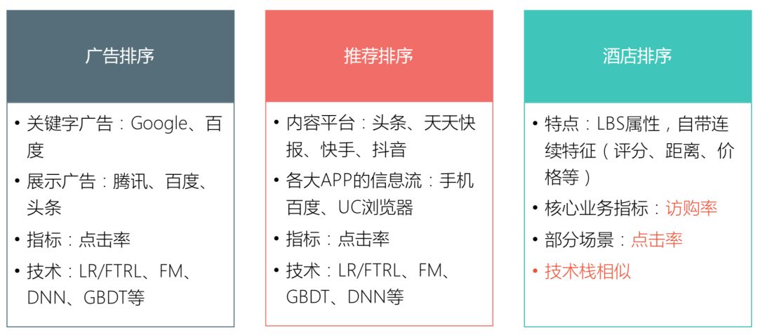 排序其实是一个典型的技术问题,业界应用比较广泛的有广告排序和推荐排序,广告排序比如Google和百度的关键字广告排序,今日头条、腾讯的展示广告排序。推荐排序比如快手、抖音这些短视频平台,以及各大App、浏览器的信息流。广告排序和推荐排序优化的目标都是点击率,技术栈也比较相似,包括LR/FTRL、FM/FFM、GBDT、DNN等模型。