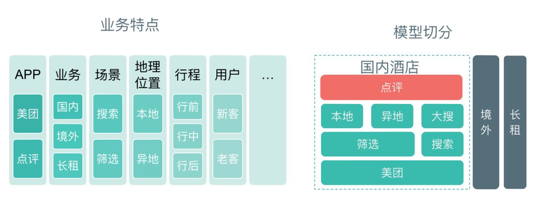 这里介绍一个业务特点导致的比较独特的问题:模型切分。美团酒店有很多业务场景,包括国内酒店、境外酒店、长租、钟点房等;还有两个App,美团App和大众点评App;还有搜索和筛选两种场景,搜索带查询词,筛选没有查询词,两种场景差异较大;从地理位置维度,还可以分成本地和异地两种场景。