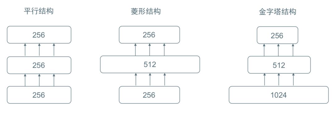 在MLP阶段我们对网络结构做了大量实验,尝试过三种网络结构:平行结构、菱形结构、金字塔结构。在很多论文中提到三者相比平行结构效果最好,但是因为酒店搜索的数据不太一样,实验发现金字塔结构效果最好,即上图最右边的“1024-512-256”的网络结构。同时还实验了不同网络层数对效果的影响,实验发现3-6层的网络效果较好,更深的网络没有额外收益而且线上响应时间会变慢,后面各种模型探索都是基于3到6层的金字塔网络结构进行尝试。