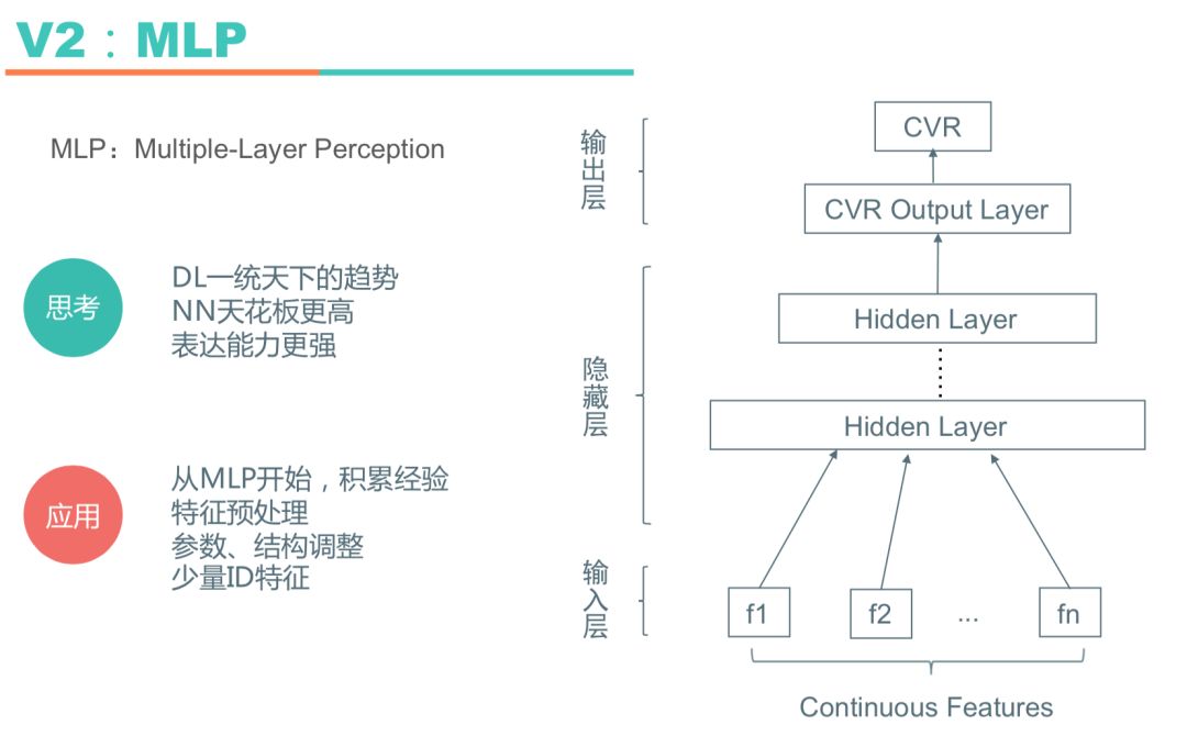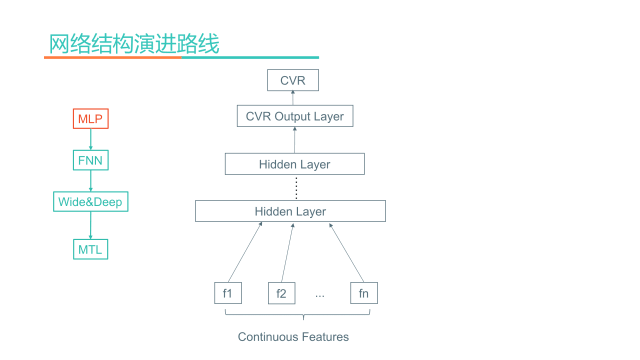 上图是MLP的网络结构图,包含输入层、若干个隐藏层、输出层。在很长一段时间内,在特征相同的情况下,MLP效果不如XGB,所以有段时间线上使用的是XGB和MLP的融合模型。后来经过大量的网络结构调整和参数调整,调参经验越来越丰富,MLP才逐步超越XGB。这里额外说明一下,酒店搜索中有少量的ID类特征,在第一版MLP里ID类特征是直接当做连续特征处理的。比如城市ID,ID的序关系有一定的物理意义,大城市ID普遍较小,小城市开城晚一些,ID较大。