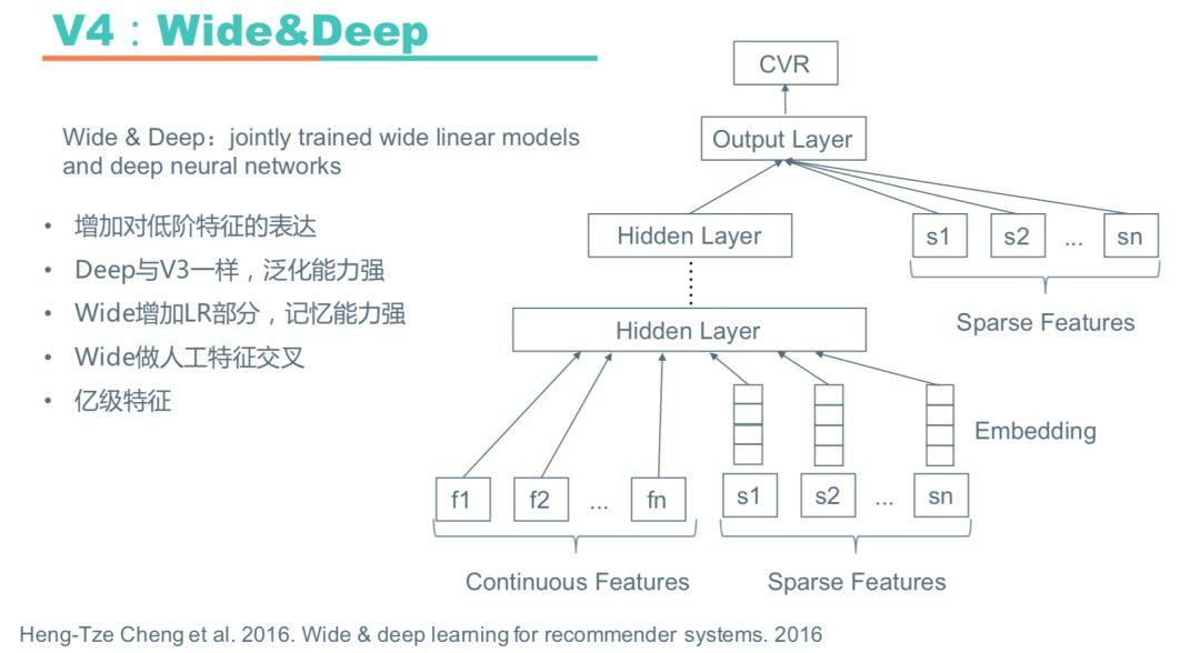 最终,我们还是把目光转回Wide&Deep。Wide&Deep同时训练一个Wide侧的线性模型和一个Deep侧的神经网络,Wide部分提供了记忆能力,关注用户有过的历史行为,Deep部分提供了泛化能力,关注一些没有历史行为的Item。之前的工作主要集中在Deep测,对低阶特征的表达存在缺失,所以我们添加了LR模块以增加对低阶特征的表达,Deep部分和之前的V3一样。刚开始只用了少量的ID类特征,效果一般,后来加了大量人工的交叉特征,特征维度达到了亿级别后效果才得到很好的提升。下图是我们的V4模型: