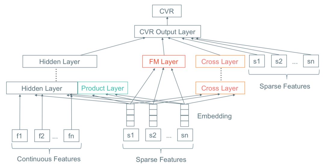 这是我们自己设计的混合网络,它融合了FNN、DeepFM、PNN、DCN、Wide&Deep等不同网络的优点,同时实现了一阶特征、显式二阶特征组合、显式高阶特征组合、隐式高阶特征组合等,有兴趣的同学可以尝试一下。