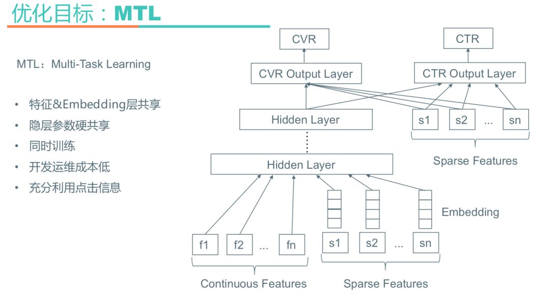 模型切换到神经网络后就可以做多任务学习了,之前树模型时代只预测“End to End”真实访购率,神经网络则可以通过多任务学习同时预测CTR展示点击率和CVR点击消费率。多任务学习通过硬共享的方式同时训练两个网络,特征、Embedding层、隐层参数都是共享的,只在输出层区分不同的任务。上图是酒店搜索当前线上的模型,基于Wide&Deep做的多任务学习。