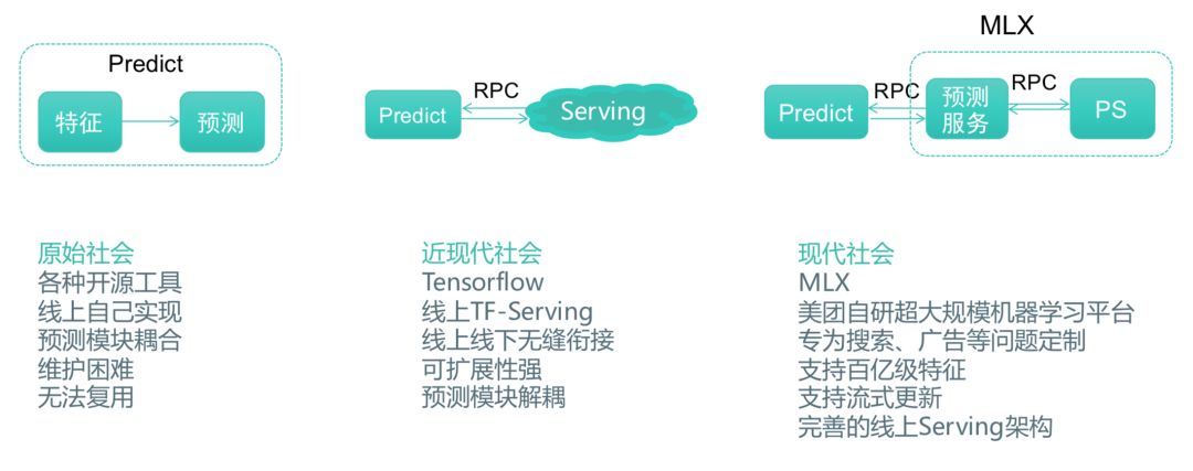 后来组内决定一起探索,大家统一使用TensorFlow,线上用TF-Serving,线上线下可以做到无缝衔接,预测代码和特征模块也解耦了。现在则全面转向MLX平台,MLX是美团自研的超大规模机器学习平台,专为搜索、推荐、广告等排序问题定制,支持百亿级特征和流式更新,有完善的线上Serving架构,极大地解放了算法同学的生产力。