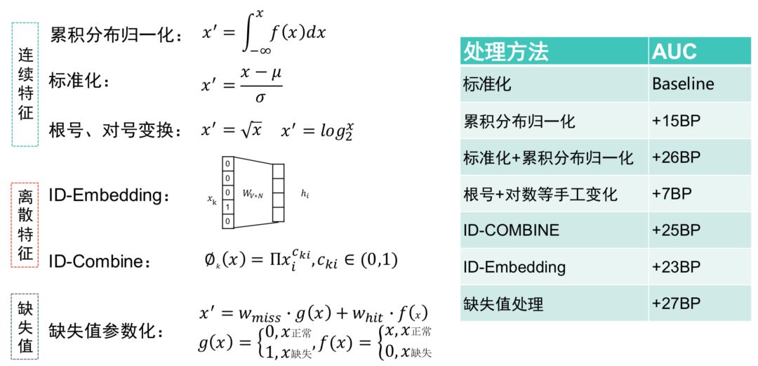 在特征预处理方面对连续特征尝试了累计分布归一化、标准化,以及手工变换如根号变换、对数变换等;累积分布归一化其实就是做特征分桶,因为连续特征多且分布范围很广,累积分布归一化对酒店搜索的场景比较有效。