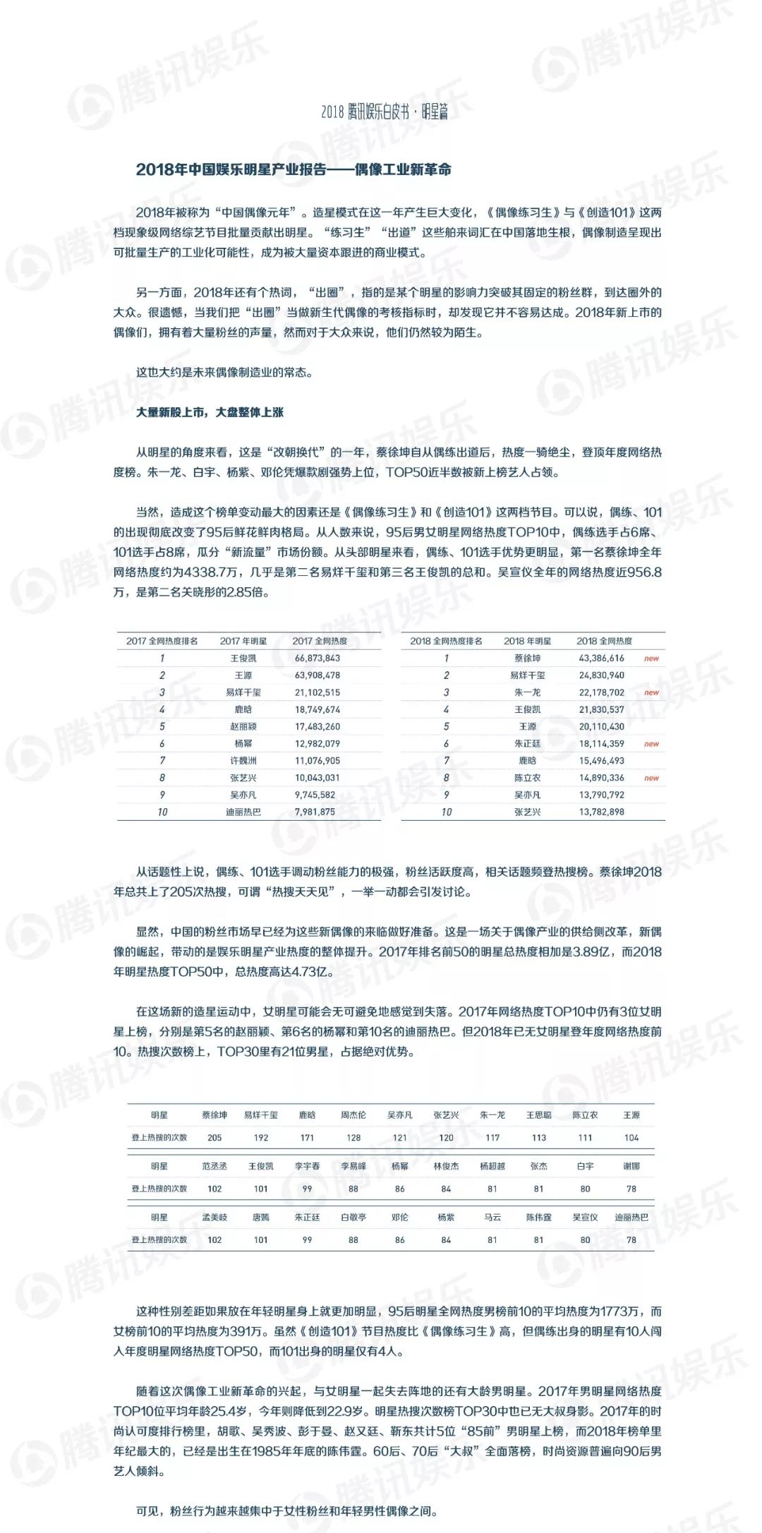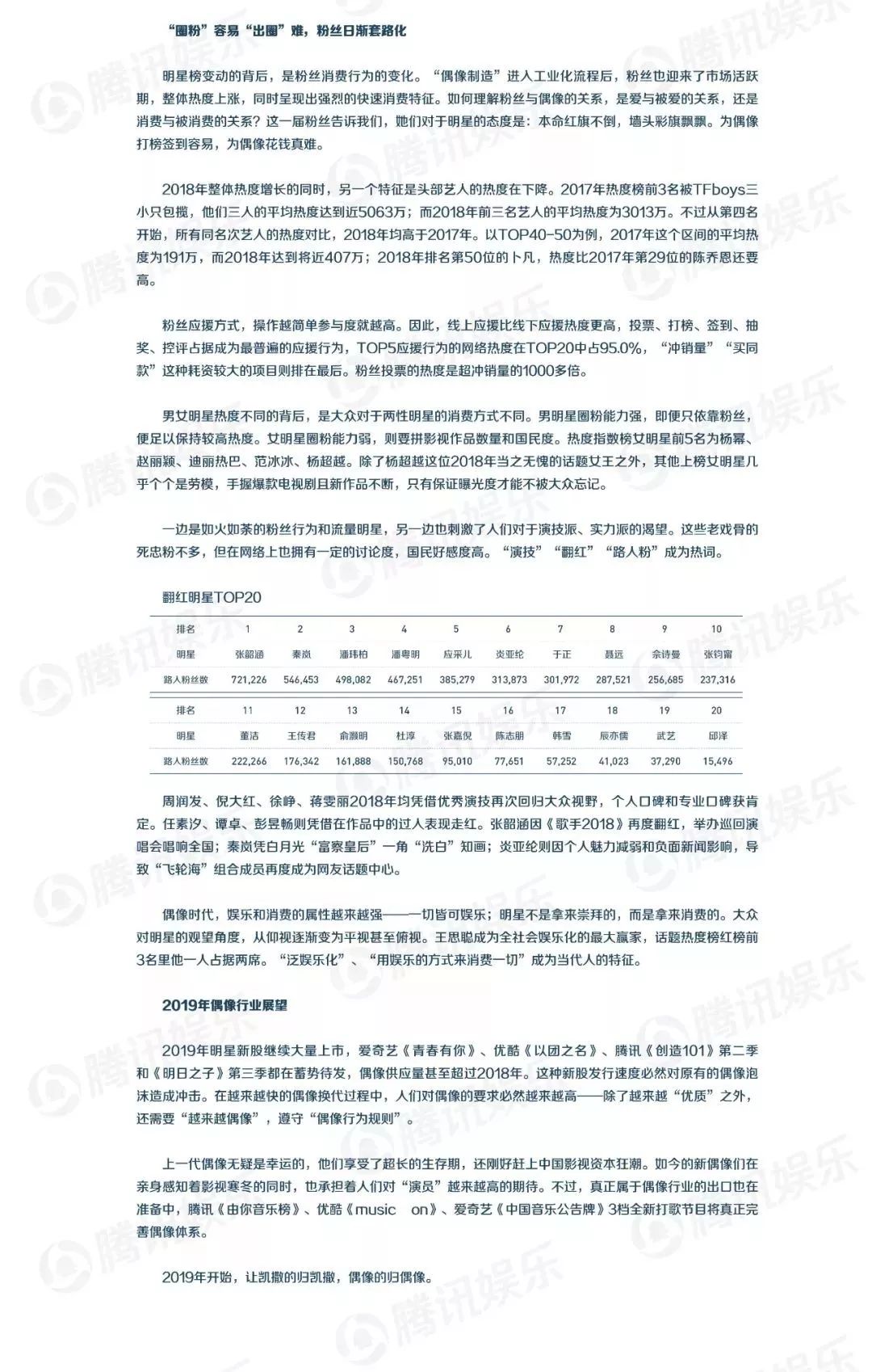 2018腾讯娱乐白皮书·明星篇:偶像工业新革命 更多阅读:腾讯娱乐&艾漫数据:2015年腾讯娱乐白皮书–明星篇2018腾讯娱乐白皮书·音乐篇:神曲贯耳 粉丝救市腾讯娱乐&艾漫数据:2015年腾讯娱乐白皮书–明星篇2018腾讯娱乐白皮书·电影篇:口碑倒逼票房腾讯娱乐&艾漫数据:2015年腾讯娱乐白皮书–音乐篇腾讯娱乐&艾漫数据:2015年腾讯娱乐白皮书–电视篇2017腾讯娱乐白皮书综艺篇:网者荣耀腾讯娱乐:2017白皮书电影篇-与“狼”共舞2017腾讯娱乐白皮书电影篇:与狼共舞2017腾讯娱乐白皮书明星篇:“人设”的游戏街舞元年谁夺头筹?DataStory联合腾讯娱乐发布街舞综艺战况大数据微博动漫:2020微博动漫白皮书阿拉丁:2019上半年小程序白皮书2019年京东5G白皮书中国留学生白皮书