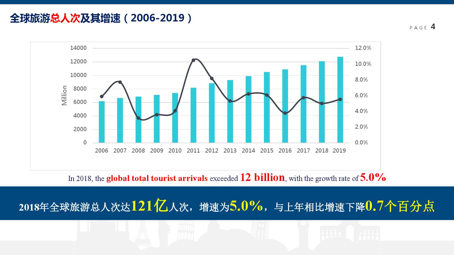 世界旅游城市联合会与中国社会科学院旅游研究中心共同发布了《世界旅游经济趋势报告(2019)》(以下简称报告)。报告提到,2018年全年全球旅游总人次达121亿,较上年增加5.8亿人次,增速为5%,与2017年相比,增速下降0.7个百分点。
