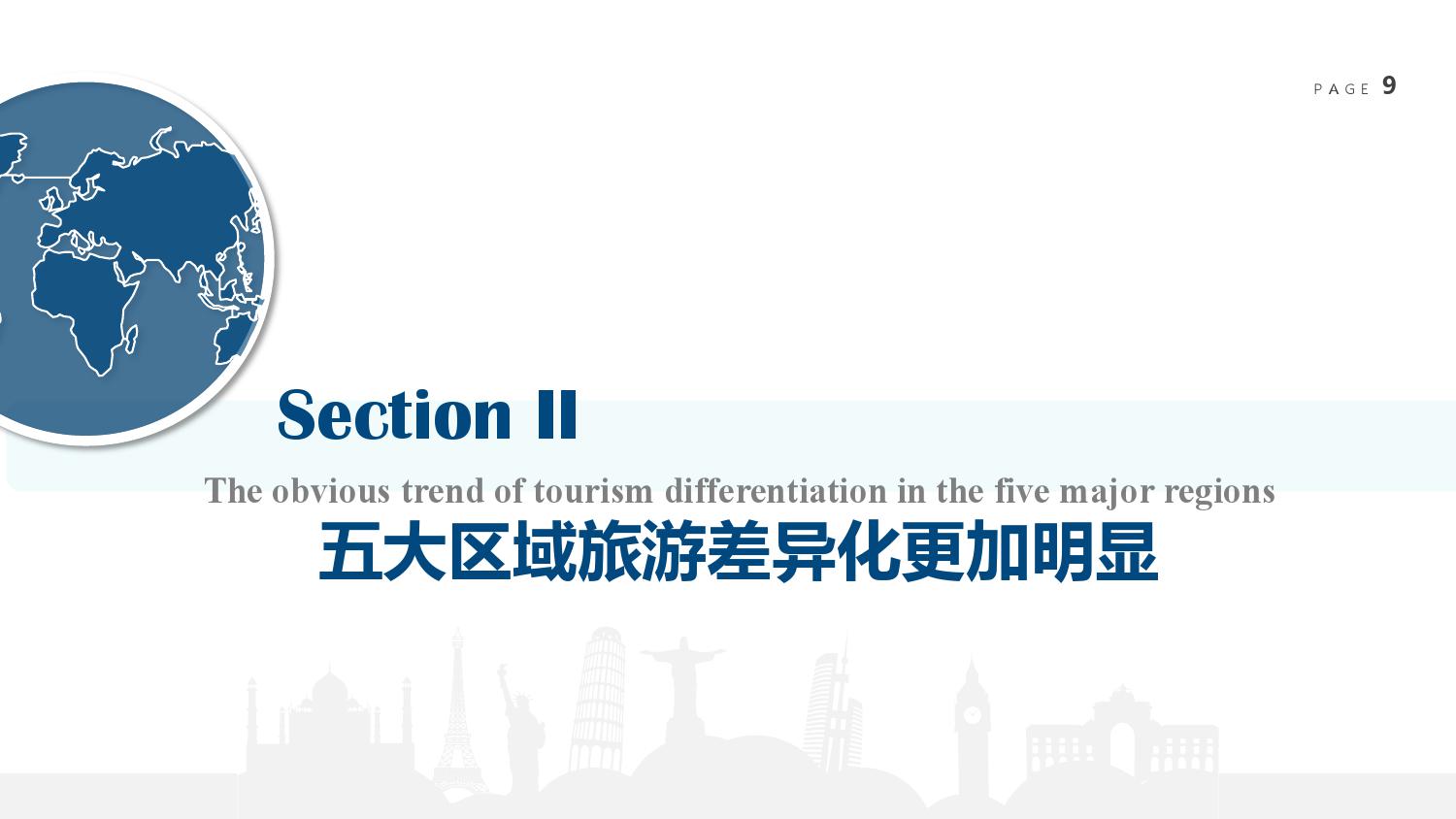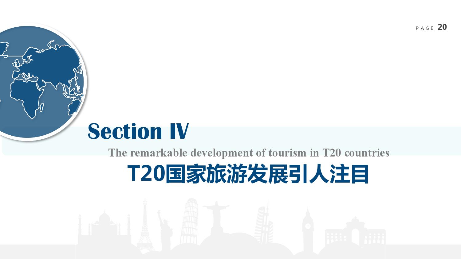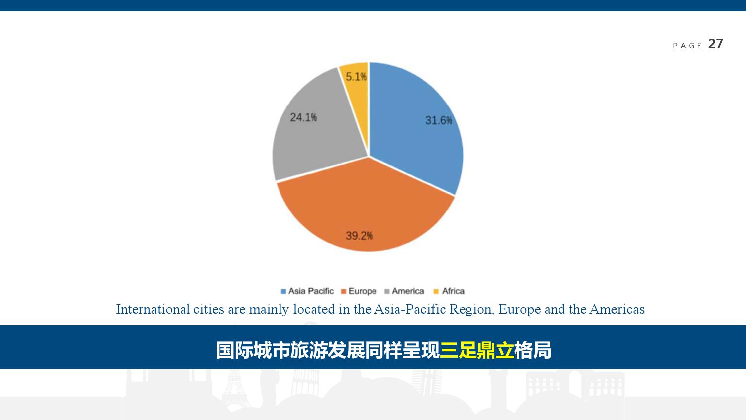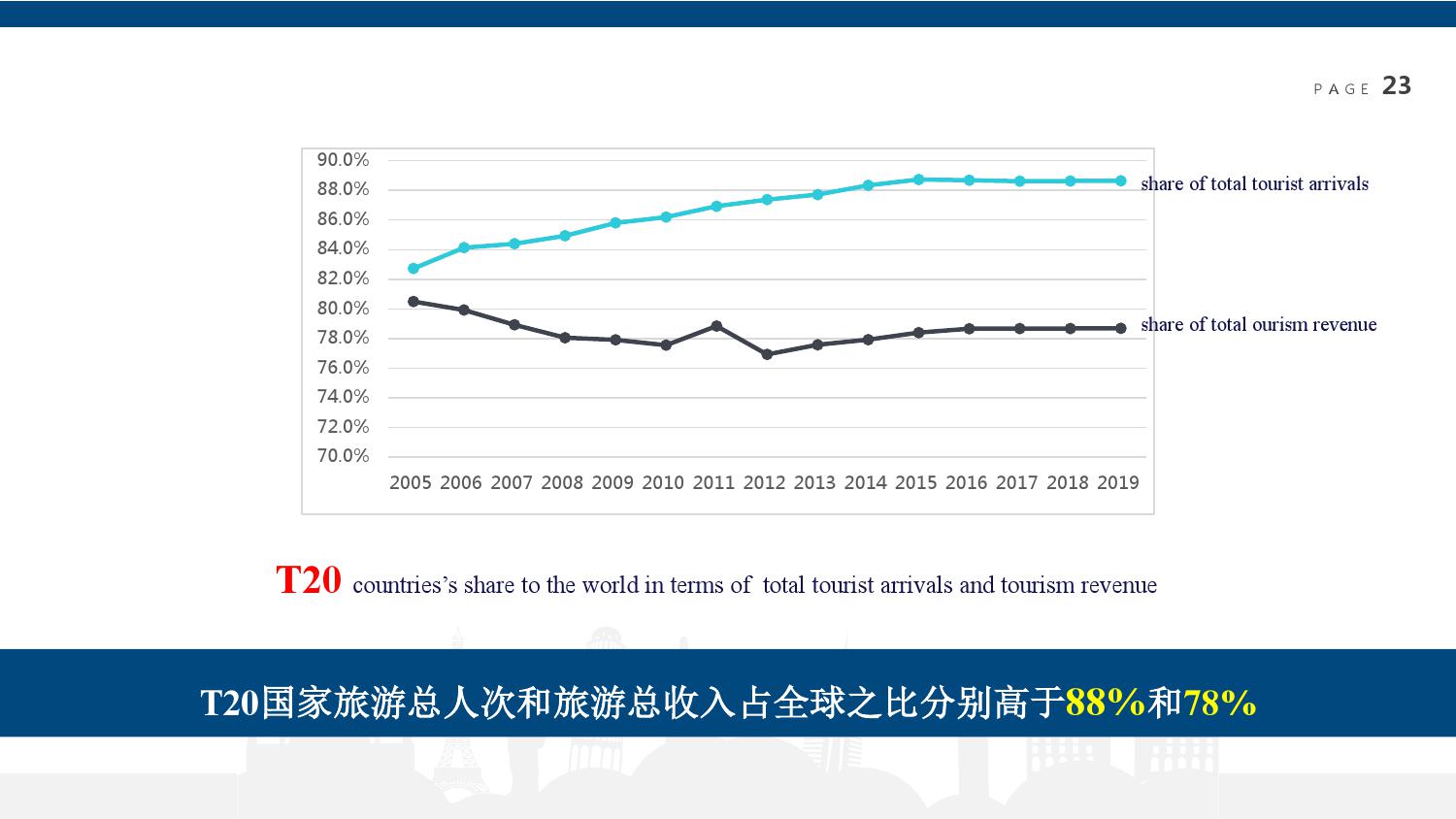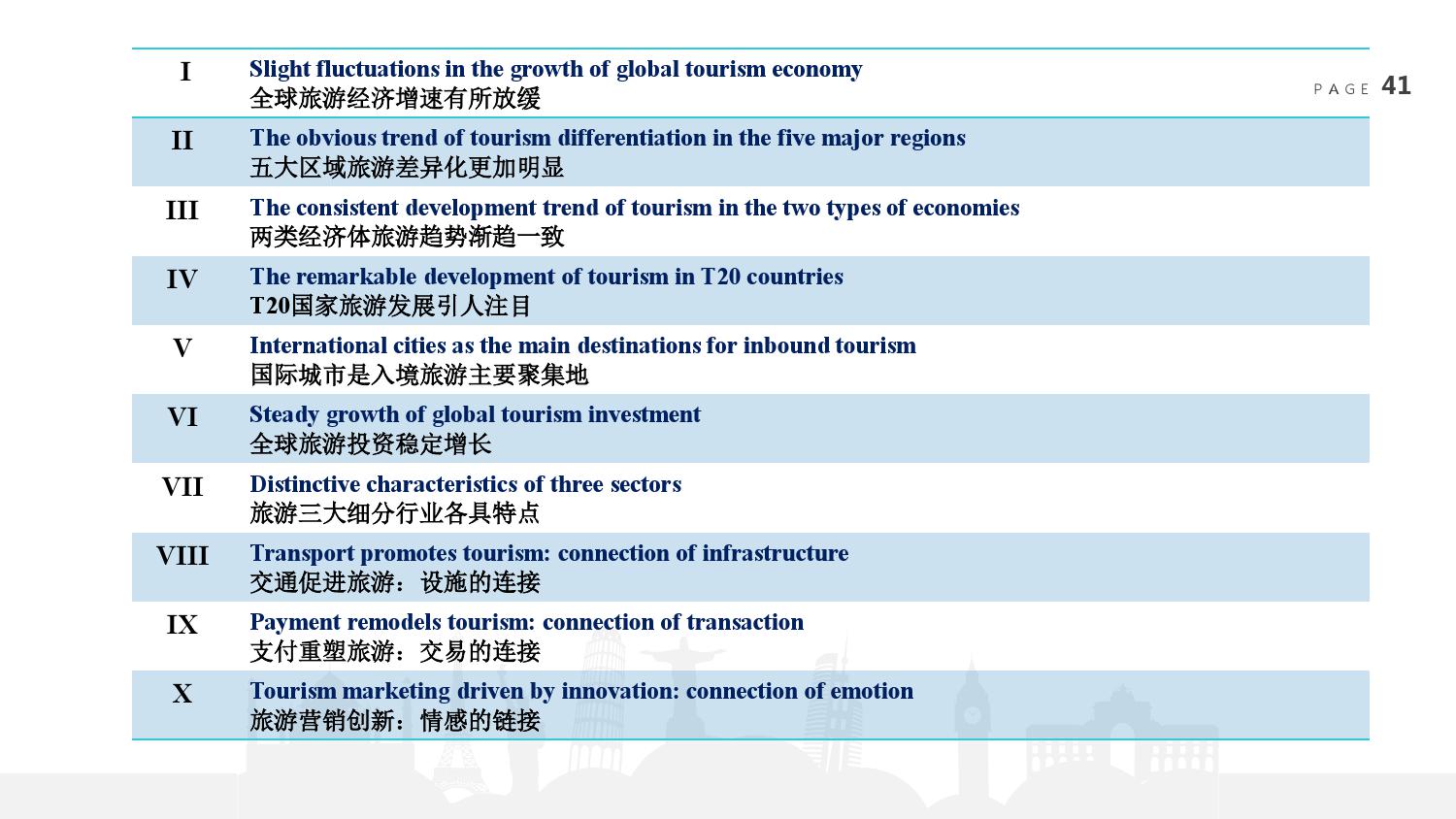 报告总结了以下七大特点:一是2019年全球经济增长趋缓,但旅游经济稳步上涨。二是全球五大区域旅游发展渐趋明显,亚洲增长、欧洲下滑。三是亚太旅游投资规模、增速均列各大洲前茅。四是创新性提出“T20”国家概念,T20国家创造全球旅游八成收益。五是支付手段变革助推旅游消费升级。城市仍是入境旅游者的主要目的地,95%的国际城市来自于亚太、欧洲和美洲;六是以虚拟技术、全产业链合作等为代表的6大营销创新打造旅游新体验。七是城市仍是入境旅游者的主要目的地。