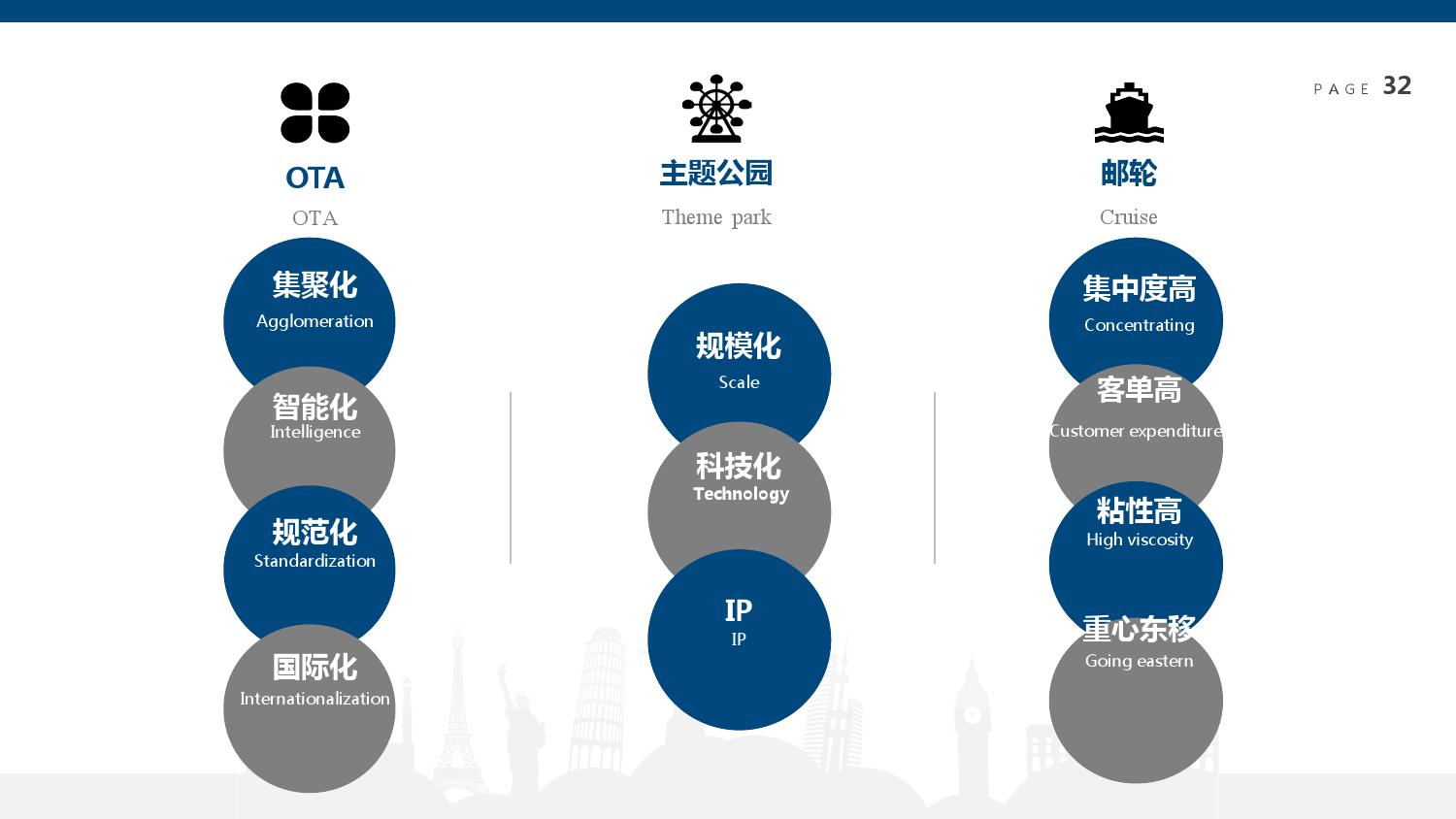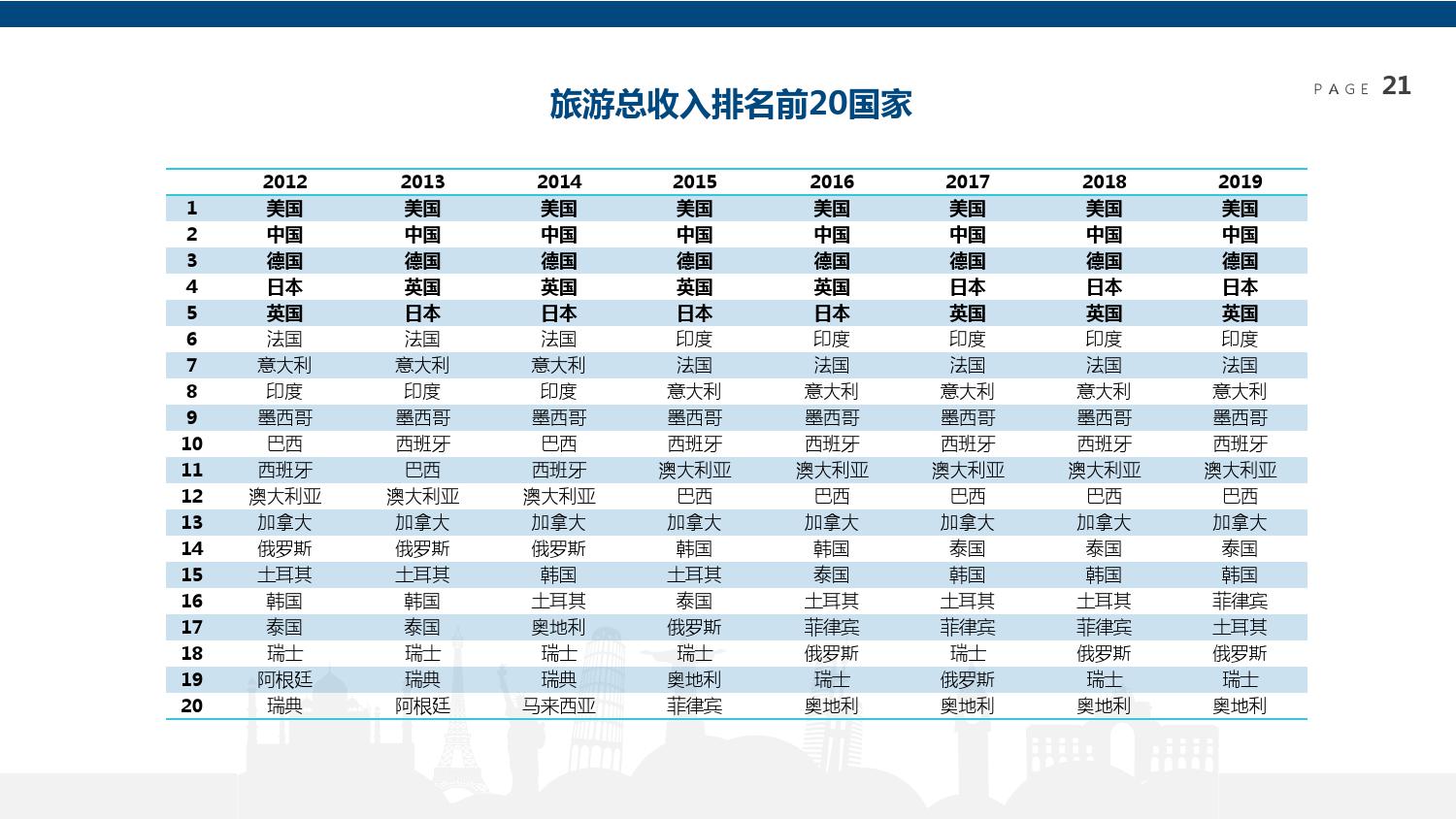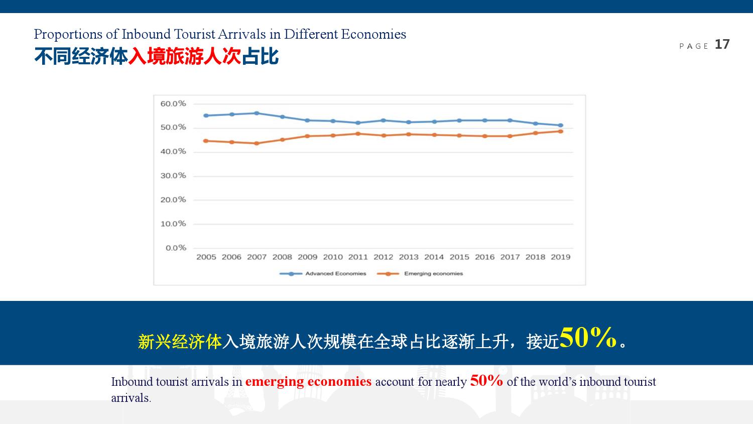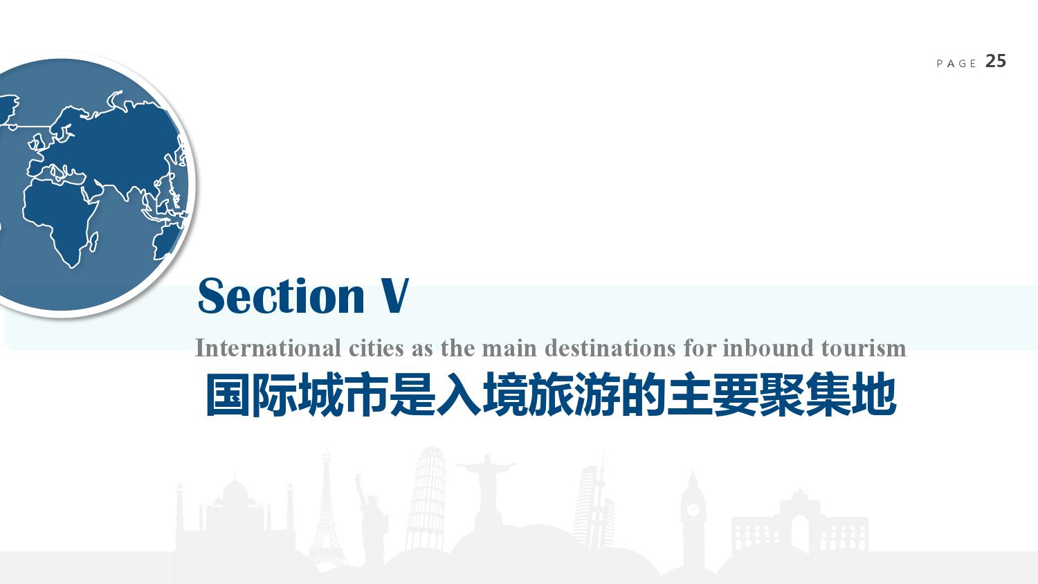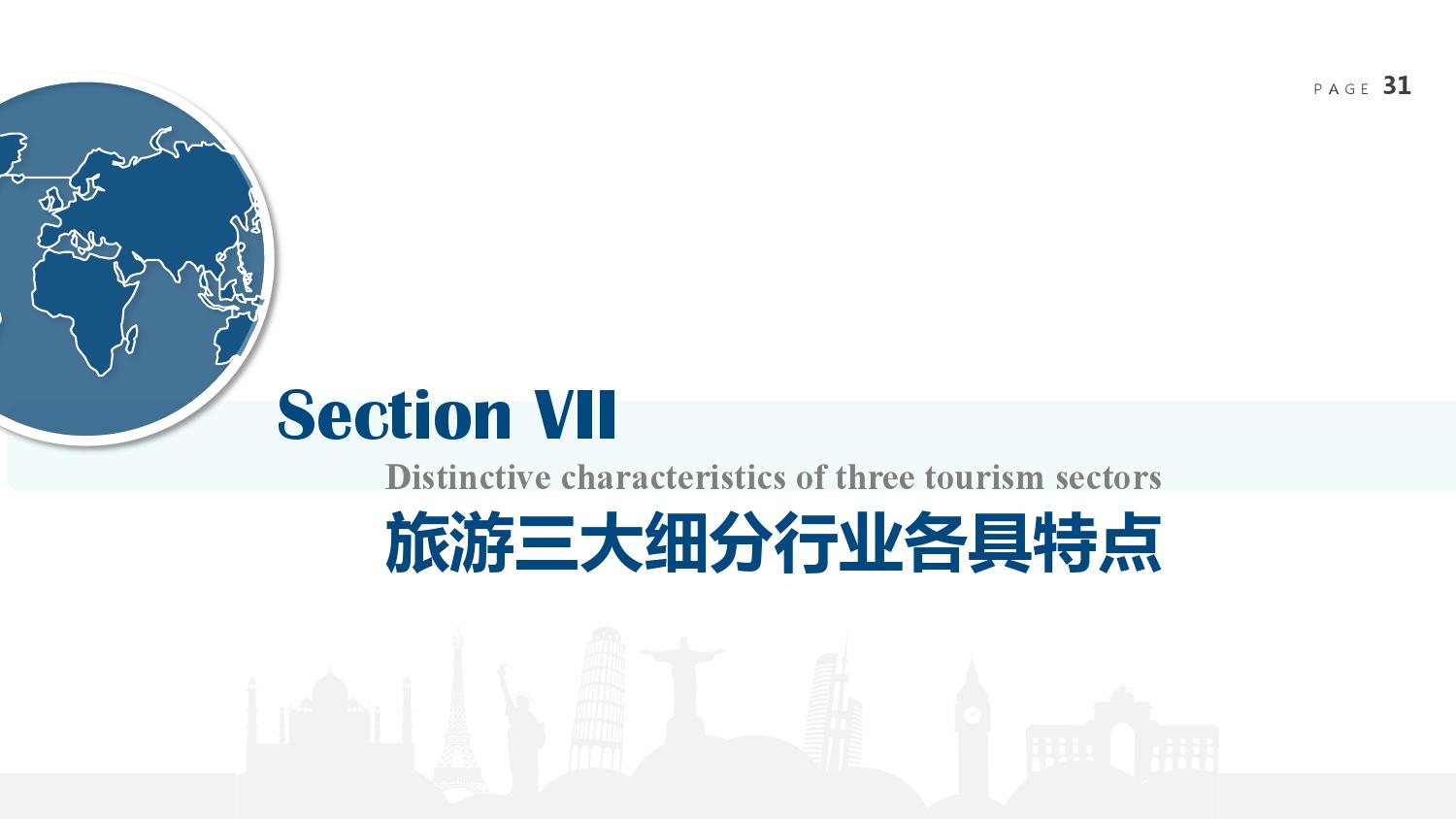 报告总结了以下七大特点:一是2019年全球经济增长趋缓,但旅游经济稳步上涨。二是全球五大区域旅游发展渐趋明显,亚洲增长、欧洲下滑。三是亚太旅游投资规模、增速均列各大洲前茅。四是创新性提出“T20”国家概念,T20国家创造全球旅游八成收益。五是支付手段变革助推旅游消费升级。城市仍是入境旅游者的主要目的地,95%的国际城市来自于亚太、欧洲和美洲;六是以虚拟技术、全产业链合作等为代表的6大营销创新打造旅游新体验。七是城市仍是入境旅游者的主要目的地。