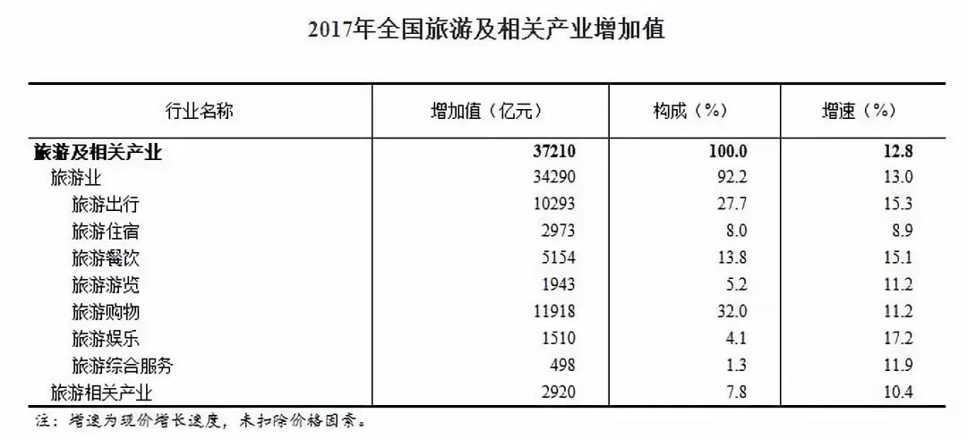 国家统计局:2017年全国旅游及相关产业增加值为37210亿元 经核算,2017年全国旅游及相关产业增加值为37210亿元,比上年增长12.8%(未扣除价格因素,下同),比同期GDP现价增速高1.9个百分点,占GDP的比重为4.53%,比上年提高0.08个百分点。从分行业数据来看,旅游出行服务、旅游餐饮服务、旅游娱乐服务增长较快,增加值增速分别为15.3%、15.1%和17.2%。 更多阅读:国家统计局:2021年全国旅游及相关产业增加值占GDP比重为3.96%2018年山西省旅游产业大数据报告GSWS&SRI:2013年度全球医疗健康旅游产业规模约为4386亿美元 中国达600亿元Tripadvisor:2020年旅游报告UNWTO:预计今年国际游客数量将下降58%YouGov:超过一半的英国人对英国游客持负面看法Sojern:2023年中东旅游胜地引领全球旅游复苏Kensington Tours:2025年旅游趋势报告Sensor Tower:2024年旅游应用和品牌营销报告Statista:美国住宿行业的演变和数字平台的作用BCD:2023年旅游支付和消费报告AirDNA:2021年4-10月美国旅游圣地入住率比2019年增长25%AAA:2021年感恩节旅游预测美国商务部:2021年4月美国海外入境游客快照Expedia:2023年第二季度游客洞察