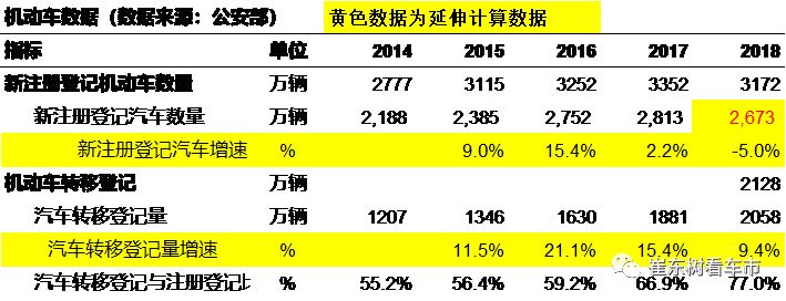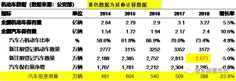 2018年汽车注册2673万台,是根据二手车的交易数量与新车的0.77的关系测算的,并非公布数据,仅供参考。2673万台的下滑5%的速度与行业的同比下滑4%的乘用车增速是基本一致的。体现了消费的下滑情况。前期的报废较多。