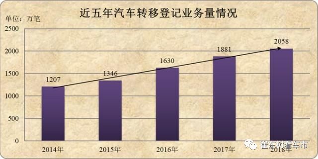 汽车转移登记业务量持续增长。2018年,全国共办理机动车转移登记2128万笔,其中汽车转移登记2058万笔,占96.72%,比2017年增加177万笔,增长9.44%。近五年汽车转移登记与注册登记业务量的比例由0.55上升至0.77,反映出二手车交易市场日益活跃。
