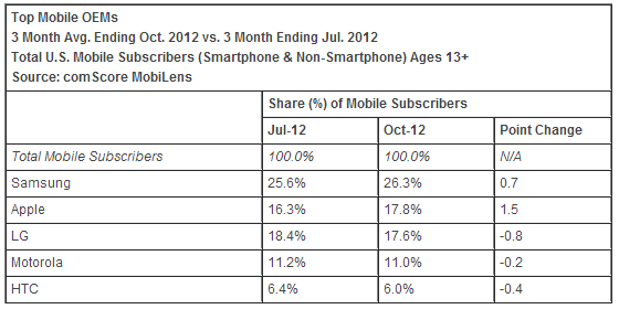 根据市场分析公司comScore的报告,10月份,美国移动设备市场的排次出现了新的变化。虽然三星继续领跑,第二名的位置却由LG换成了苹果。