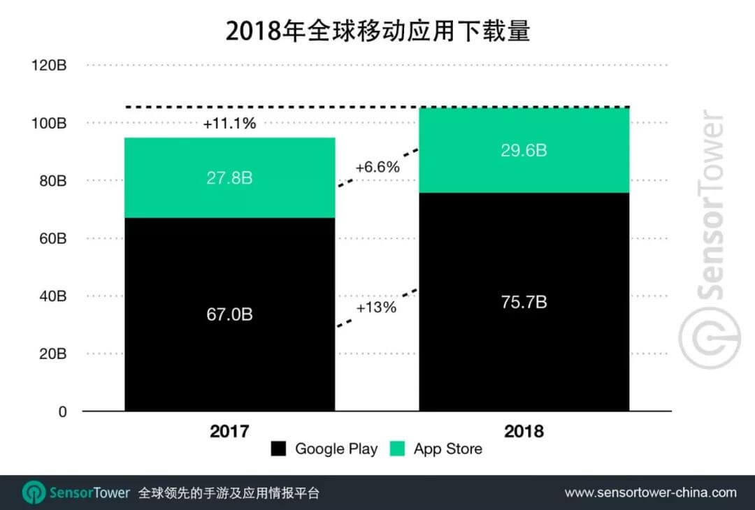 2018年App Store 和 Google Play 应用首次安装量合计超过1053亿次,年增长11.1%。对比2016至2017年的增长速度,2018年增速略有下降,主要受Google Play下载量增长轻微放缓所致。