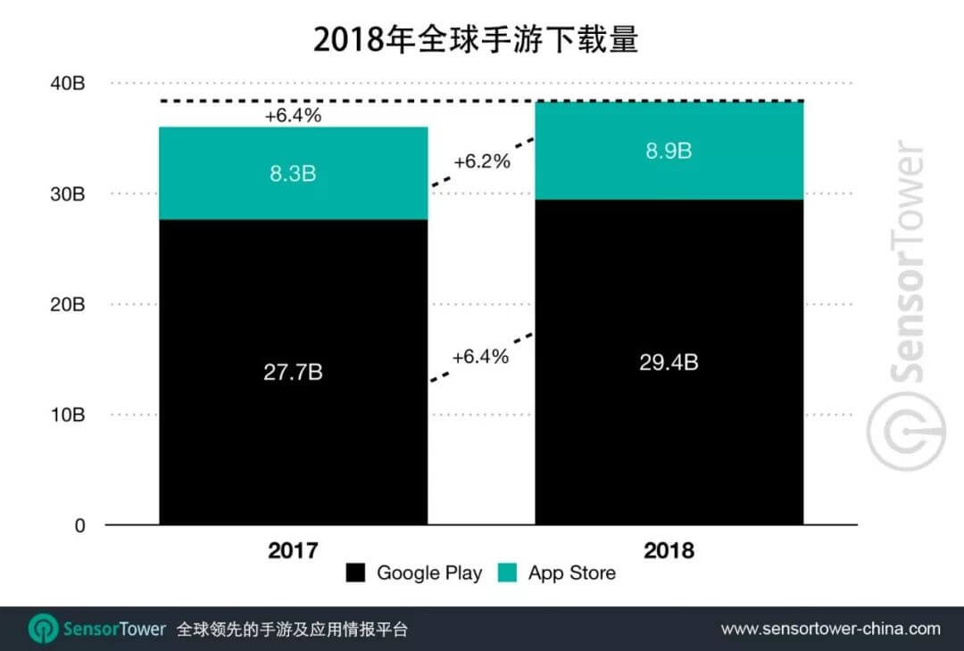 下载量方面,2018年手游在双平台下载量达到383亿次,较2017年上升6.4%。同样,Google Play手游的下载增速稍微领先于App Store。2018年期间,全球Google Play手游累计获得294亿次下载,年增长6.4%,App Store 手游下载量为89亿次,增长6.2%。