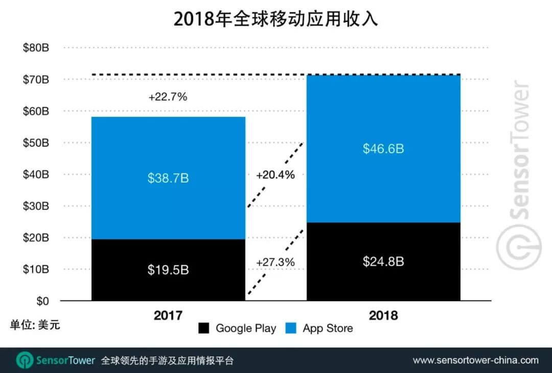 Sensor Tower商店情报数据显示,2018年全球移动用户在移动应用和手游上合计消费了713亿美元。这些消费包括在全球 App Store 和 Google Play的应用内购,订阅,以及付费应用下载。对比2017年581亿美元的营收,年增长率22.7%。