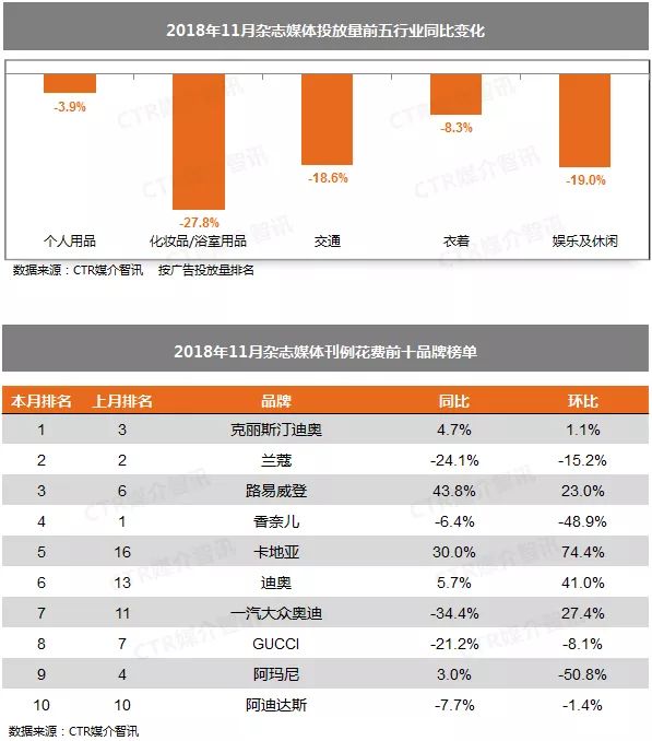 2018年11月,电视广告刊例花费同比下降14.0%,省级卫视和省级地面台的大幅下滑仍旧是电视广告刊例花费连续多月下降的主要原因。省级卫视2018年11月广告花费同比减少16.7%,省级地面台的广告花费同比减少16.2%。时长方面,省级卫视同比缩减13.9%,省级地面台缩减19.7%。中央级频道的广告刊例花费涨幅回落,同比上涨11.9%。