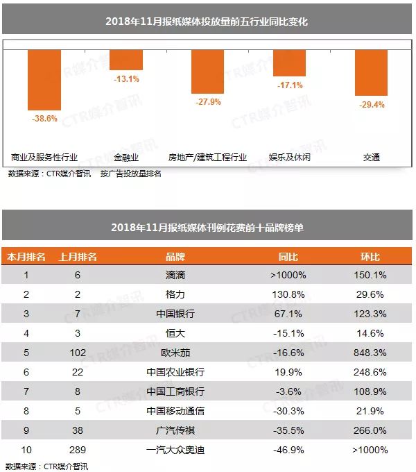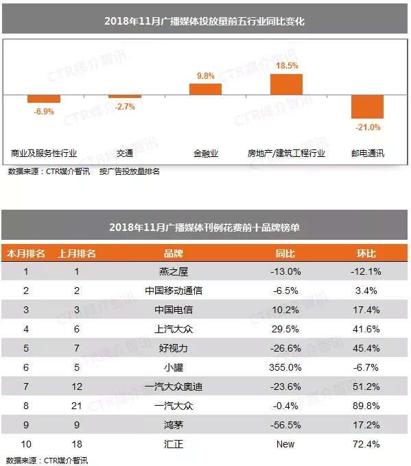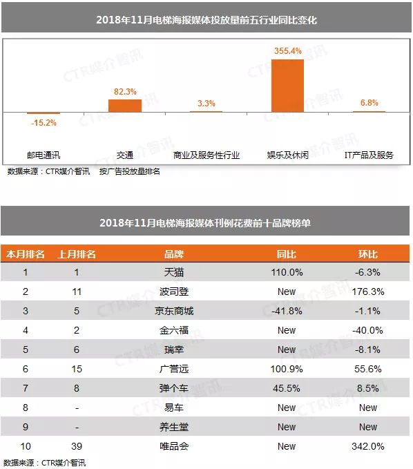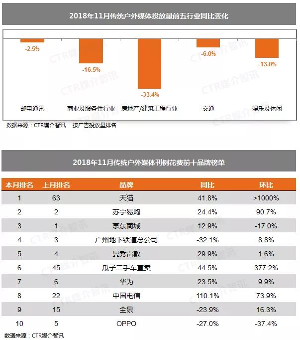 2018年11月,各大电商的促销广告仍旧火热,天猫取代京东商城占据传统户外媒体榜单首位,广告花费同比上涨41.8%,其在电梯海报的广告花费同比上涨110.0%蝉联榜首。