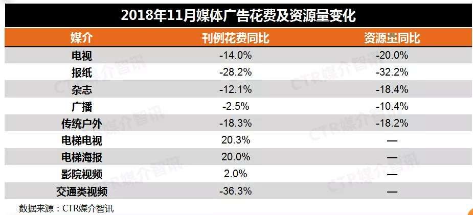 电梯类媒体的刊例收入保持着较为稳定的增长,电梯电视和电梯海报的广告花费增幅分别为20.3%、20.0%,影院视频媒体的广告花费涨幅回落,同比上涨2.0%。