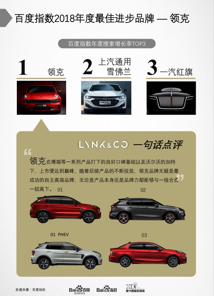 领克获得2018年度最佳进步品牌,领克在博瑞等一系列产品打下的良好口碑基础下,加上沃尔沃的加持,上市便达到巅峰。