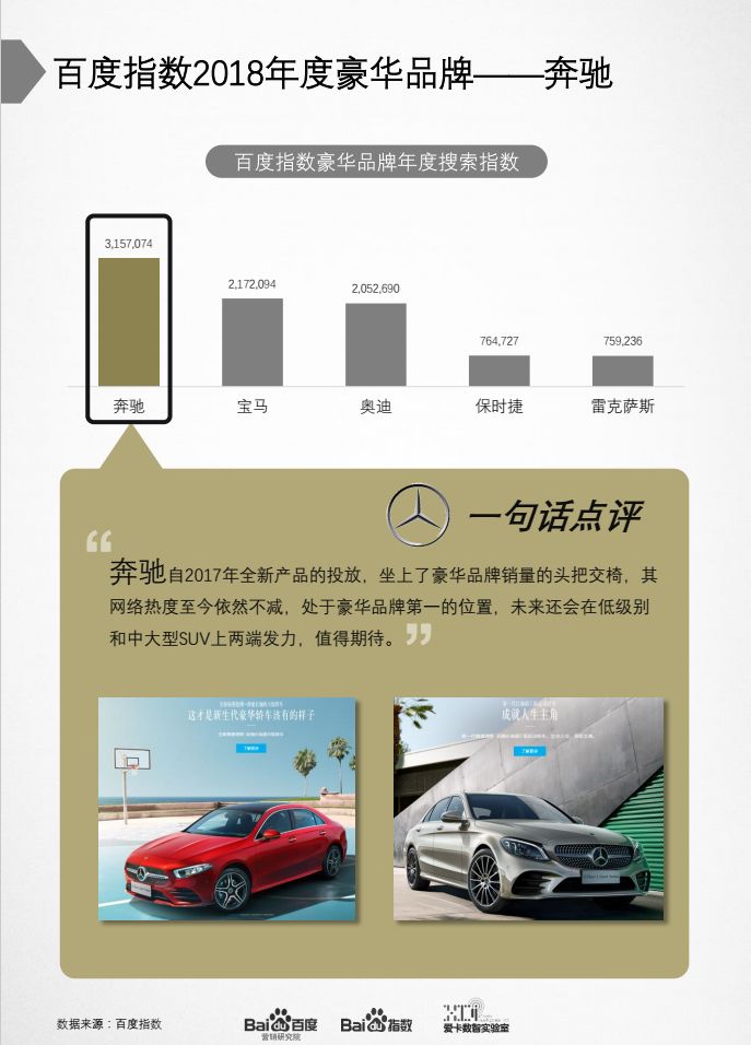 奔驰获得2018年度豪华品牌,其搜索指数超过第2名的宝马100万之多,奔驰不愧是豪华品牌销量的头把交椅。