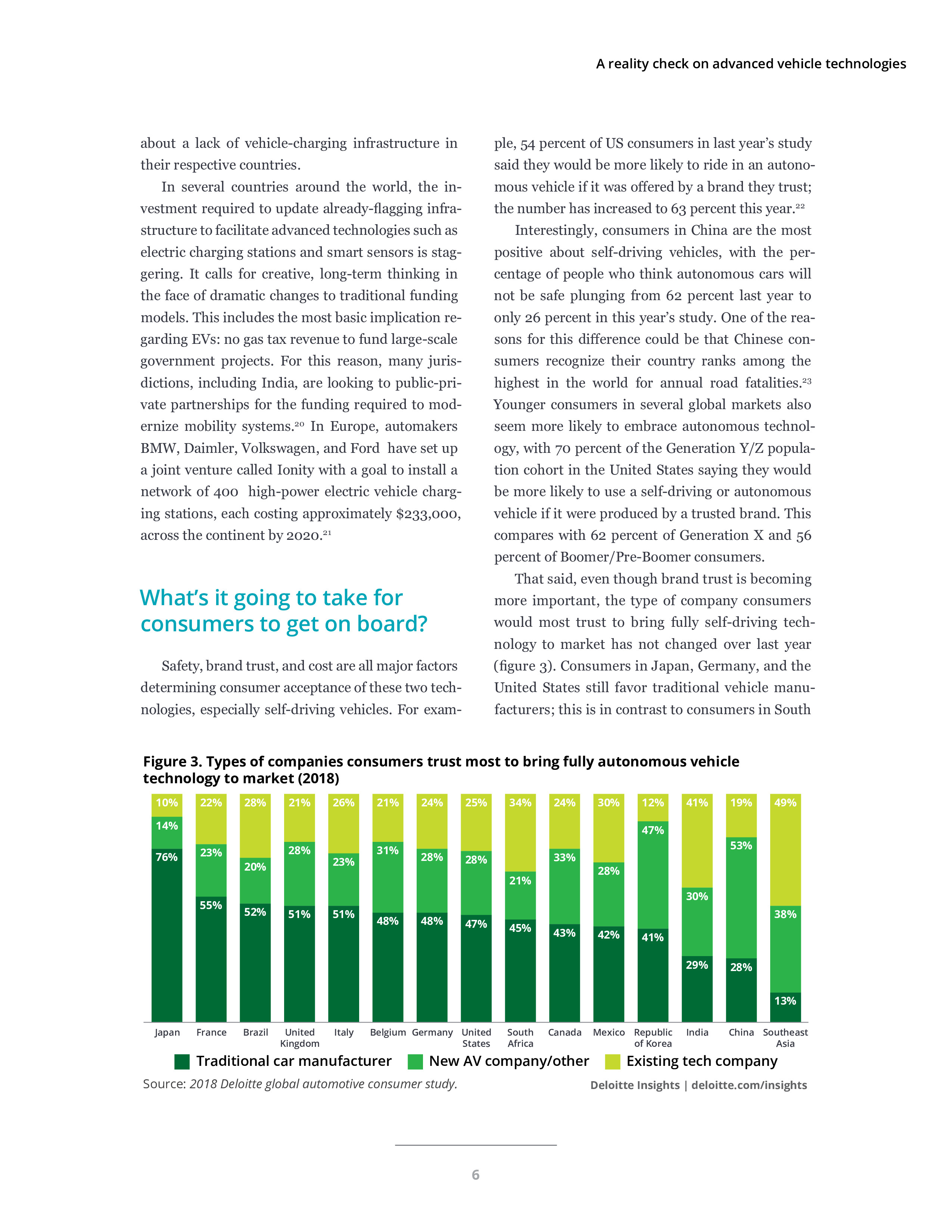 安全、品牌信任和成本都是决定消费者接受这两种技术的主要因素,尤其是自动驾驶汽车。63%的美国消费者更有可能乘坐信任的品牌提供的自动驾驶汽车。认为自动驾驶汽车不安全的中国消费者比例从去年的62%下降到今年的26%。