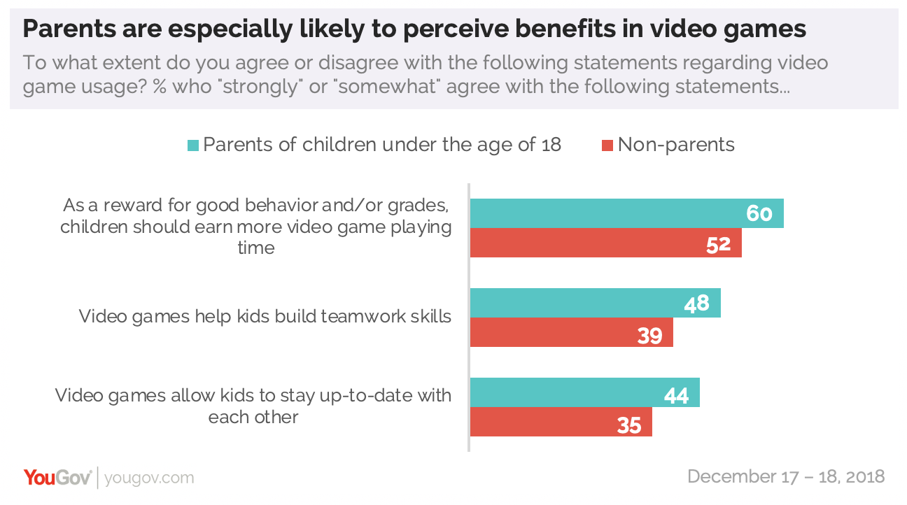 除了使用视频游戏激励孩子外,父母还注意到允许孩子玩游戏的其他好处。 YouGov的研究发现,父母比非父母更有可能同意玩视频游戏可以帮助孩子建立团队合作技能(48% vs. 39%),并允许团队间保持联系(44% vs. 35%)。