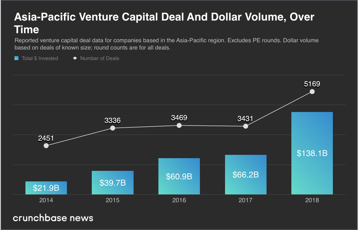 根据Crunchbase的数据,去年亚太地区初创企业共获得约1380亿美元投资,比2017年风险投资总额增长了100%以上。2018年该地区共完成5000轮投资交易,同比增长近50%。