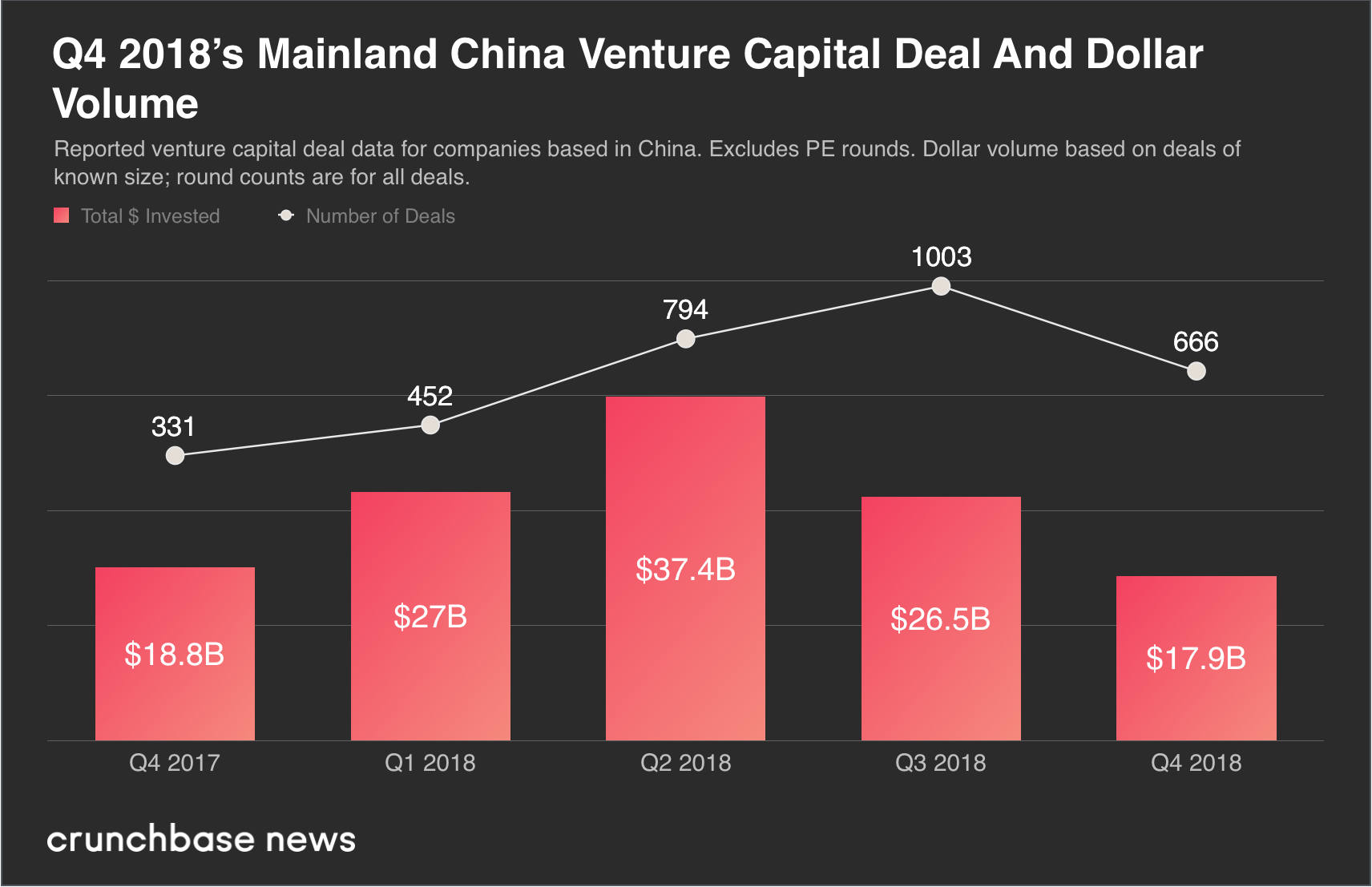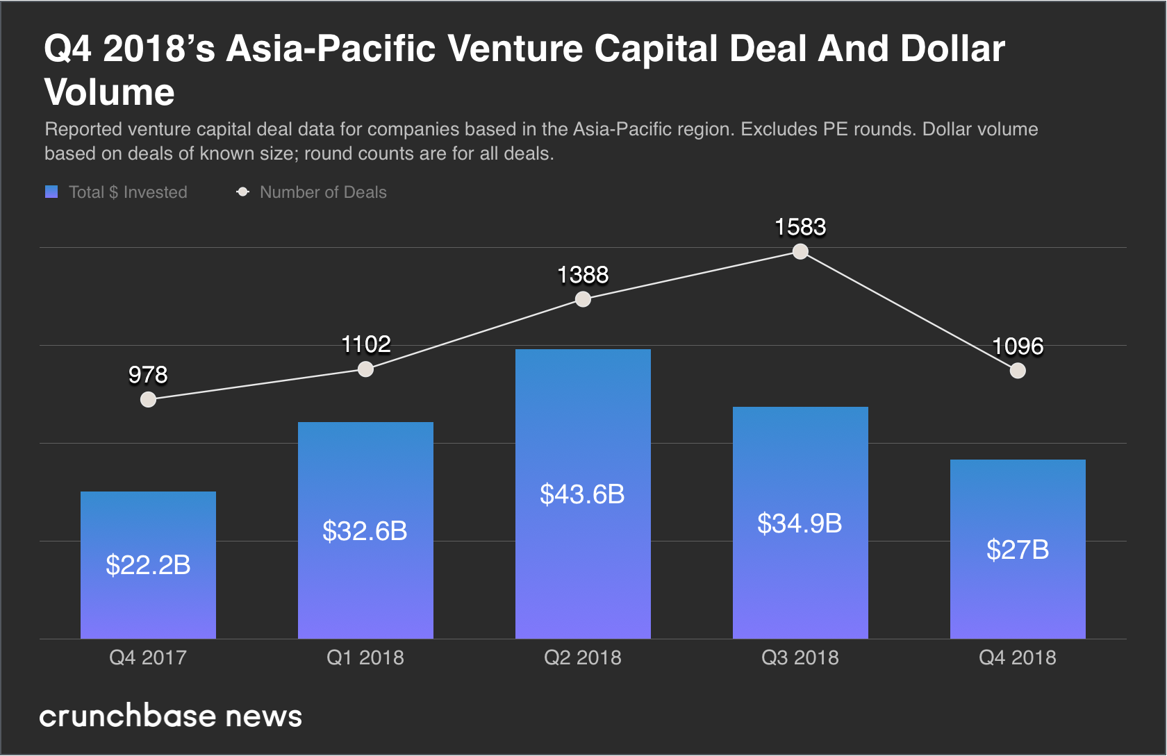 中国占2018年第四季度亚太地区风险投资总额和交易量的60%以上。因此对该地区的投资情况有很大的影响。