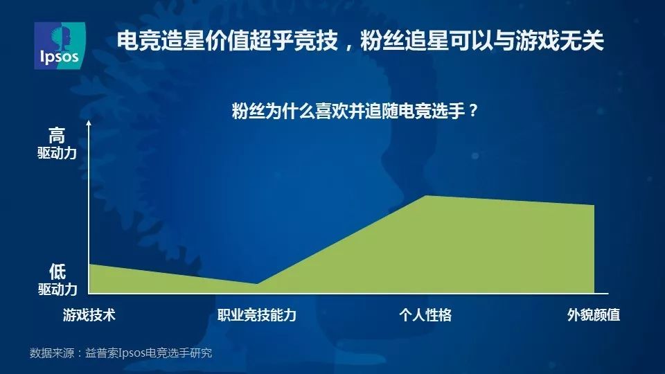 为什么粉丝会狂热的喜欢一个电竞选手?甚至电竞选手在某种意义上讲成为了大众偶像?益普索对背后的驱动力做了深层次的研究,发现粉丝被圈粉,个人竞技能力高度是重要驱动因素,但最高的驱动因素是选手个人的人设、性格和颜值。
