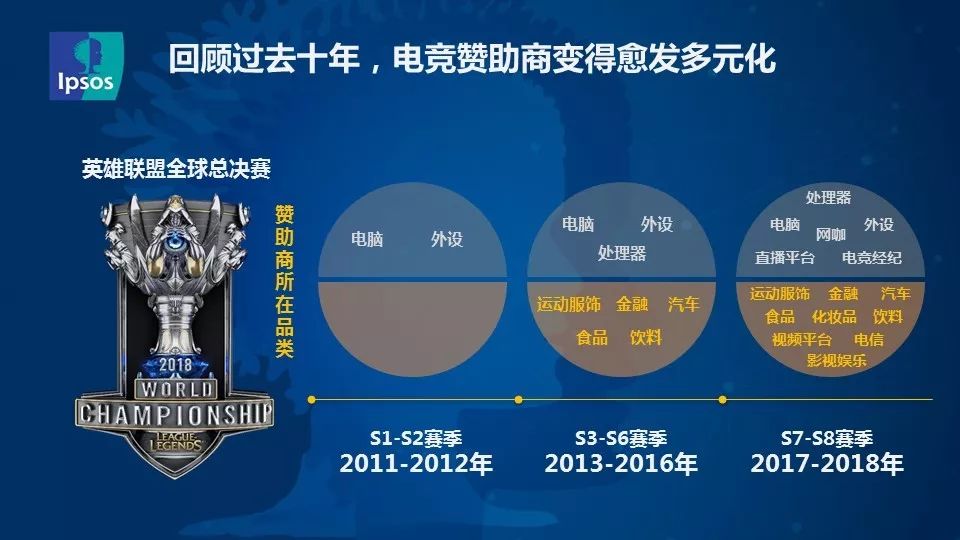 3. 2017年—2018年(S7~S8):赞助商行业多元化,涌入大量运动服饰、金融汽车、食品、饮料、乃至化妆品、影视娱乐等非专业品牌