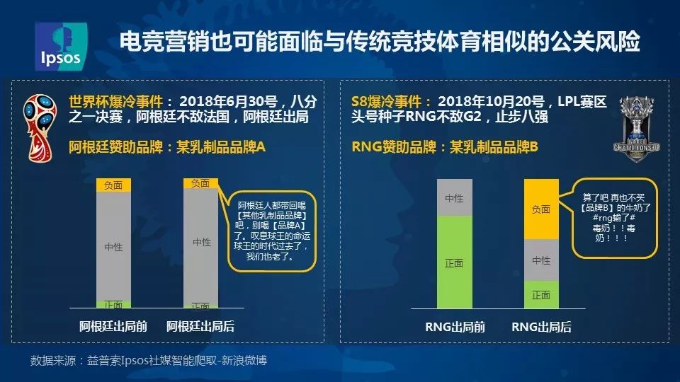 这说明品牌主在电竞营销的公关危机处理经验不如传统体育营销得心应手;另一方面也说明品牌主在赞助之前不仅要考虑品牌与电竞的契合点,也需要考虑当押宝失败,契合点是否会变成黑点,提前做好应急预案。在电竞营销的语境下,奶队友的操作和乳制品品牌十分契合,但当赛事失利,这一点也有可能将品牌主陷入不利,成为粉丝的发泄借口,给力变毒奶。