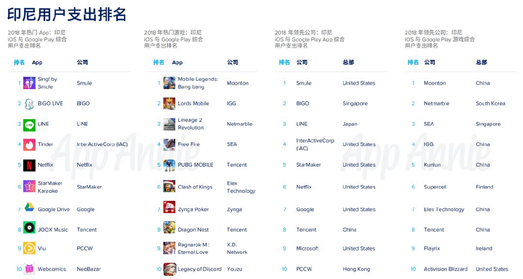注:2018 年印尼 iOS 与 Google Play 综合下载量排名、月活跃用户数排名、印度用户支出排名