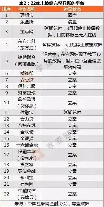 另外22家平台未披露完整的数据,其中1家仍在运营,16家已被立案,2家清盘,1家暂停发标,2家延期兑付。详情如下: