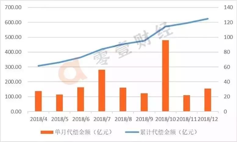 截至2018年12月底,97家平台累计代偿金额合计为625.5亿元,相比2018年3月大幅增长122.6%。7月与10月代偿金额较高,分别为56亿元和96亿元,其余月份每月代偿金额基本保持在20~30亿元左右。