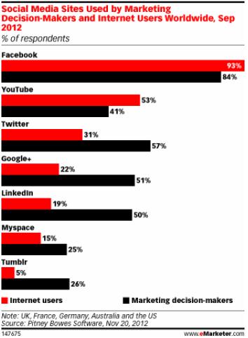 调研显示:营销人员与消费者对各种社会化媒体的关注程度呈现明显的不一致性。受访的市场营销负责人肯定了Facebook是企业重要的营销渠道这一事实。但是在其他某些渠道上,营销人员的关注程度超过了消费者:企业中使用Twitter的占57%,而消费者中关注Twitter的只占31%;企业中Google+的使用者占51%,但消费者只有21%;于此同时,相反的情况是:53%的消费者使用YouTube,但只有41%企业使用YouTube做为营销渠道。