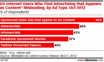 随着内容营销的出现,企业在进行营销的时候还要注意内容的使用,尤其在使用“Facebook Sponsored Stories”和“Promoted Tweets”这样的广告产品时要非常谨慎。MediaBrix在10月份的调研发现:57%的用户看到Facebook上的Sponsored Stories后认为其内容具有误导性,Promoted Tweets为45%。