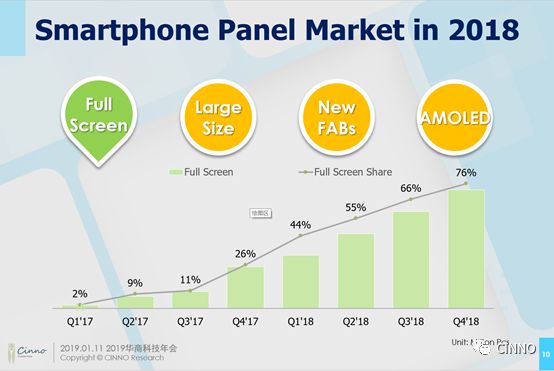 如果拿四个关键此来形容过去一年当中全球手机面板的状况,我们选的分别是全面屏、大尺寸、新工厂、AMOLED。2018年是全面屏快速成长的时期,在2018年第四季度的时候全面屏的占比已经达到76%,大家可以想象一下全球每十片智能机的面板出货当中就有将近八片是全面屏。全面屏的兴起很大程度上也催生了大屏,我们这边对大屏手机的定义是尺寸在6寸及以上的手机面板。在2018年Q4的时候我们预计,6寸及以上大屏手机面板的市占就会达到55%。