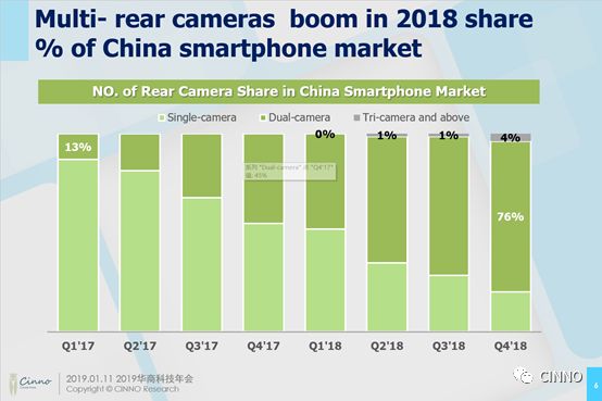 刚刚在图片的分享当中我们就讲到了后置摄像头,2018年4月份的时候,华为的第一款后置三摄的发布,直接影响了2018年后置多颗摄像头的成长。2018年四季度的时候,后置多个摄像头的市占只有4%,我带大家回顾一下,2016年9月份的时候,iPhone 7PLUS是全球第一颗后置双摄的发布,在2017年第一季度的时候,后置双摄在中国大陆市场的市占是13%,仅仅两年的时间,在2018年第四季度的时候我们再看一个数据,后置双摄的市占已经达到76%,有将近六倍的增长,并且在品牌的新品规划部门我们也了解到,在这种多颗摄像头也会成为品牌在2019年规划中的产品亮点去设计,所以我们对后置多颗摄像头的市场是抱有很大的期望的。