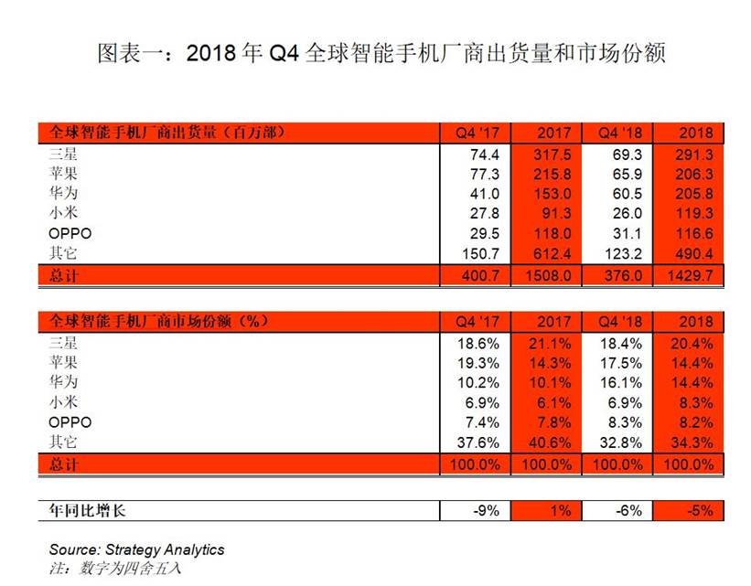 Strategy Analytics最新发布的研究报告指出,2018年Q4全球智能手机出货量年同比下降6%,为3.76亿部。2018年全年智能手机出货量下滑5%,智能手机行业首次出现全年下滑。在2018年的最后一个季度,三星以18%的全球智能手机市场份额保持第一,苹果iPhone排名第二,而华为排在第三位。
