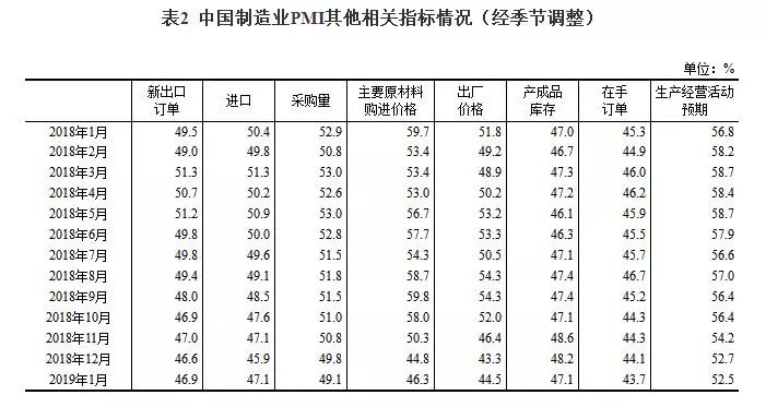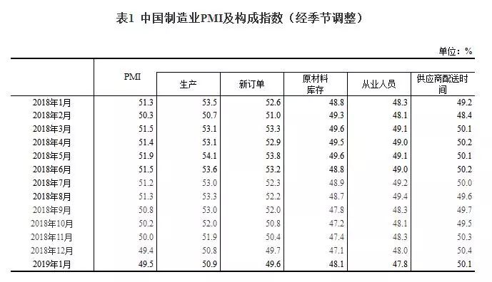2019年1月份,中国制造业采购经理指数(PMI)为49.5%,比上月微升0.1个百分点。