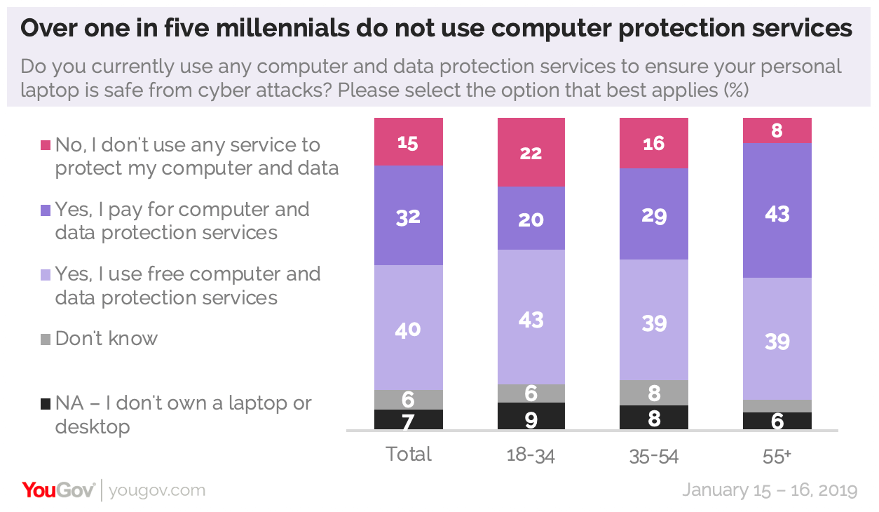 YouGov的研究发现,大多数人会使用某种形式的PC保护措施(72%),包括免费和付费服务。55岁及以上的美国人最有可能使用保护措施,同时也最有可能支付网络安全费用(43%),相比之下,35-54岁美国人中有29%支付网络安全费用,千禧一代中有20%支付网络安全费用。