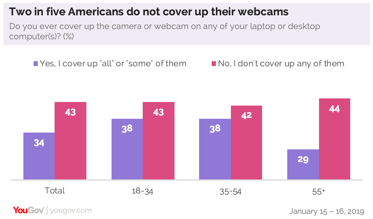 安装防病毒软件只是网络安全专家建议的一个措施。另一个简单的方法是遮盖PC上的所有摄像头,43%的美国人没有这么做。38%的千禧一代和35-54岁受访者遮盖了网络摄像头,在55岁及以上的受访者中只有29%这么做。