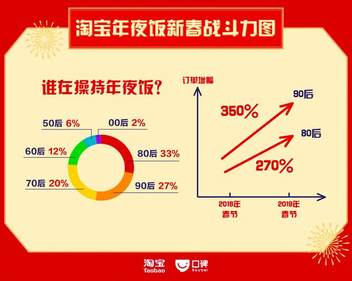 以往,年夜饭总是家中长辈操持,而如今,正在有越来越多年轻人加入了年夜饭的操持大军。据淘宝数据,从腊八开始,在淘宝上下单购买食品、酒水、零食、海鲜、肉类等年货的消费者中有超过一半为80后、90后,其中90后增幅位列第一,相比去年春节期间,订单增幅达到350%。