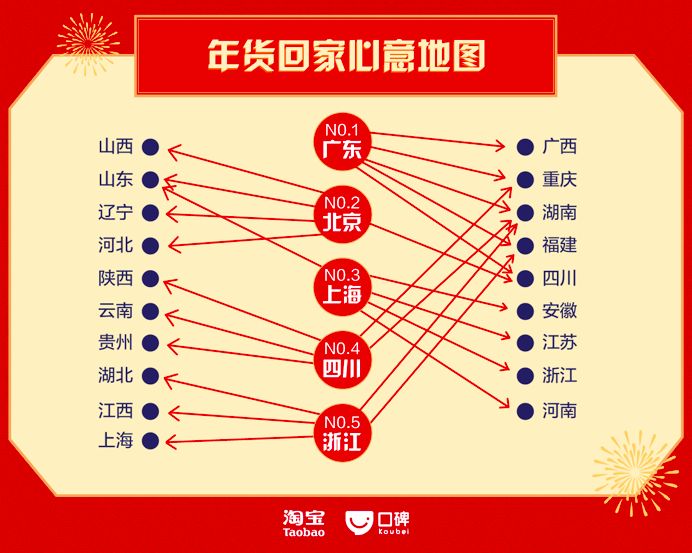春节是一年一度游子回乡的时节,在淘宝上采购年货回家,也折现了异地游子的思乡情。据淘宝数据显示,广东、北京、上海、四川、浙江成为全国游子最多的五个省市,游子们纷纷在这里下单,寄送年货回家。其中,在北京打拼的游子大多寄回山西、山东、河北等地;而驻扎在广东的游子则爱往湖南、福建、四川寄送年货。